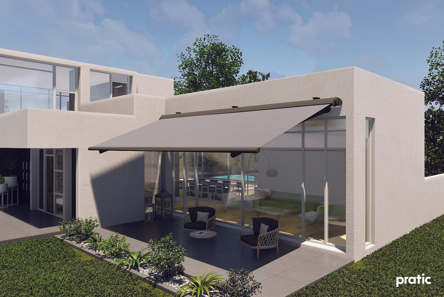 Arm awnings are the most popular choice for large balconies, terraces and gardens. Their sturdy structure, equipped with articulated arms that support the canvas, guarantees stability and resistance even in case of wind.